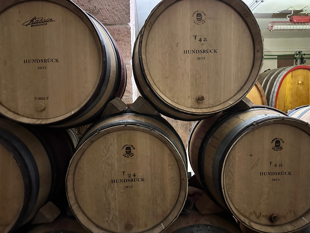 Wir verkosteten das Große Gewächs Centgrafenberg aus verschiedenen Barriques. Die Fässer stammten von unterschiedlichen Tonnellerien. Der Einfluss des jeweiligen Holzes zeigte sich deutlich im Geschmack. Die Wahl des Barriques wirkt sich spürbar auf den Charakter des Weins aus. Deshalb sind manche Küfer wie Jean-Noël Minier, Rousseau oder DAMY besonders gefragt, während andere weniger Beachtung finden.